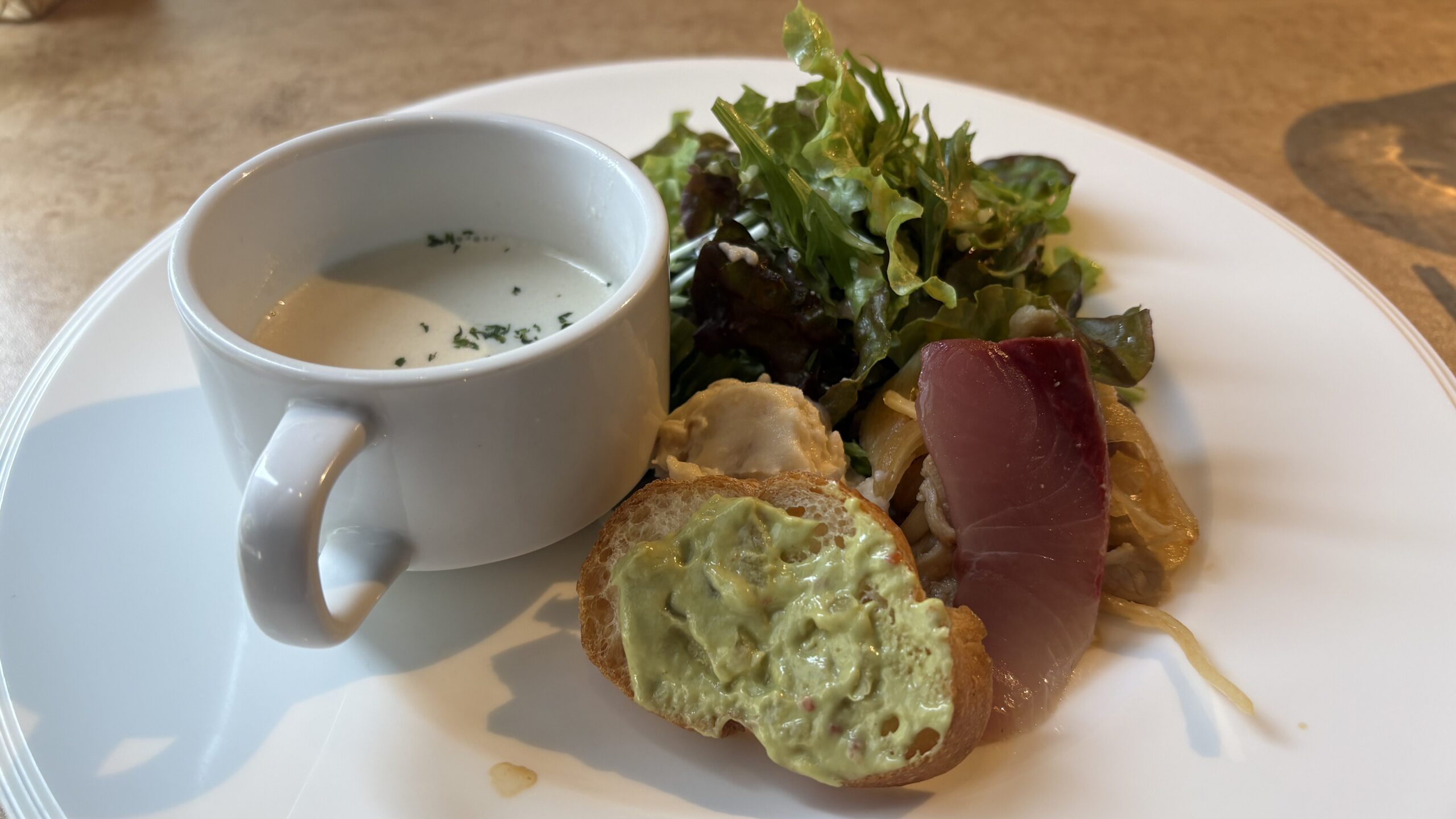 注文したのは、お目当てのハンバーグランチ。 前菜のサラダ、スープ、そしてメインのハンバーグプレート。