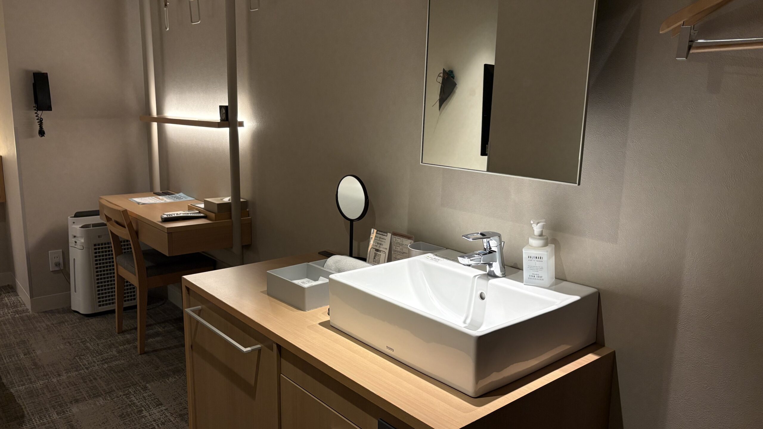 - 部屋が広い: シングルルームでも余裕のある作り。デスクもしっかりしていて、PC1台の作業なら部屋でも十分いけます。