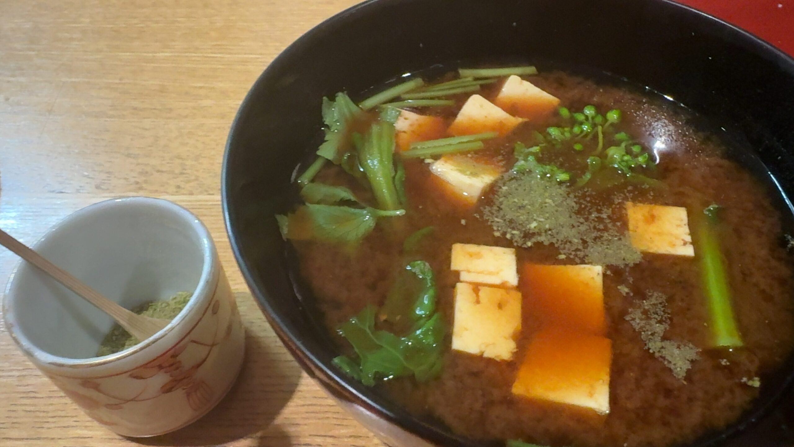 松山の甘めなお味噌の赤だしに、お好みで「山椒」をパラリ。 (※松山の赤だしは山椒の香りと相性が抜群なんです!)